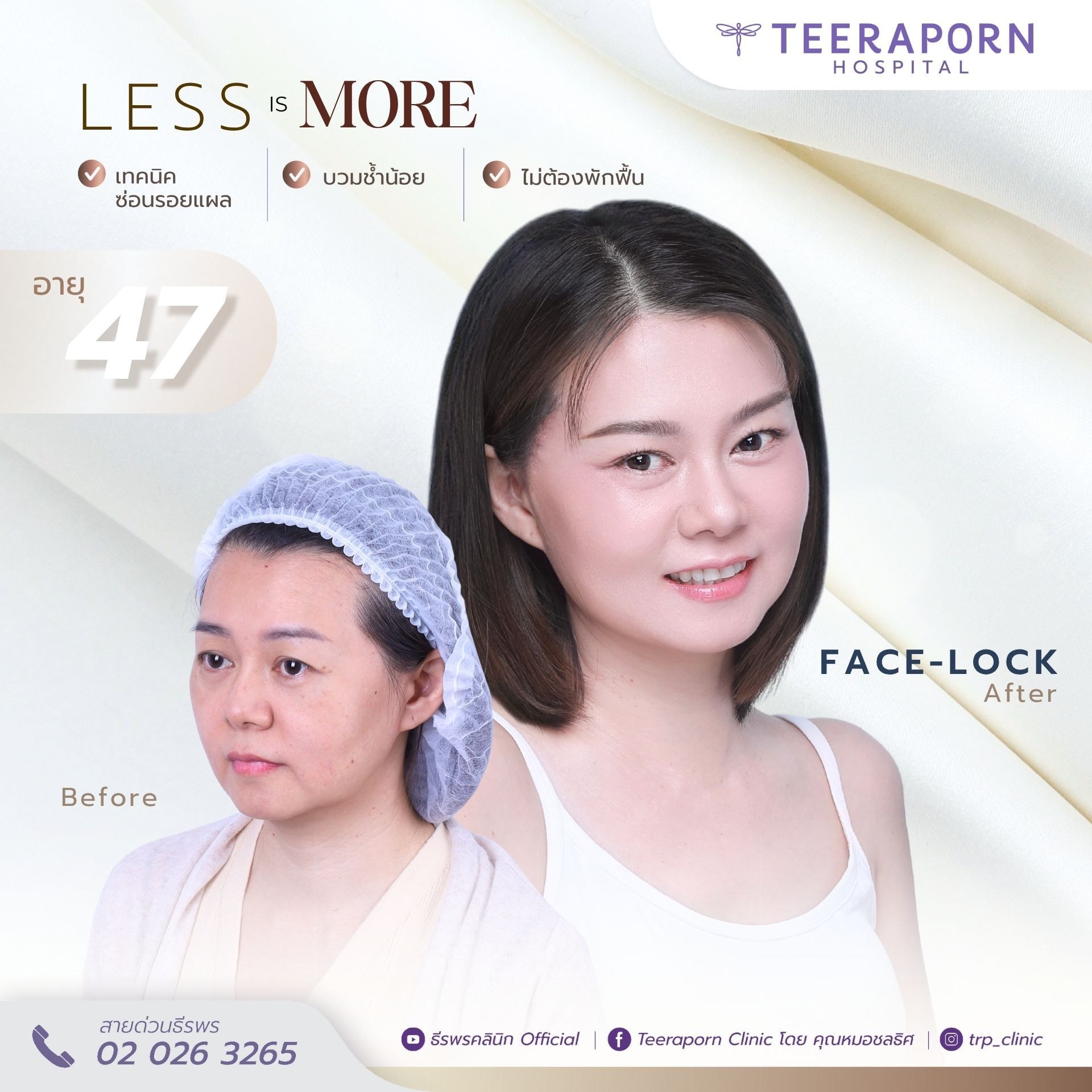 แค่คุณโอ๋ล็อคหน้า ก็ย้อนวัยได้เกินสิบปี! จากใบหน้าเหนื่อยล้า สู่ลุคสวยสดใส ไม่บอกไม่รู้ว่าอายุ 48! ด้วยเทคนิค Face-Lock ที่ธีรพร แผลเล็ก บวมน้อย ไม่ต้องพักฟื้น